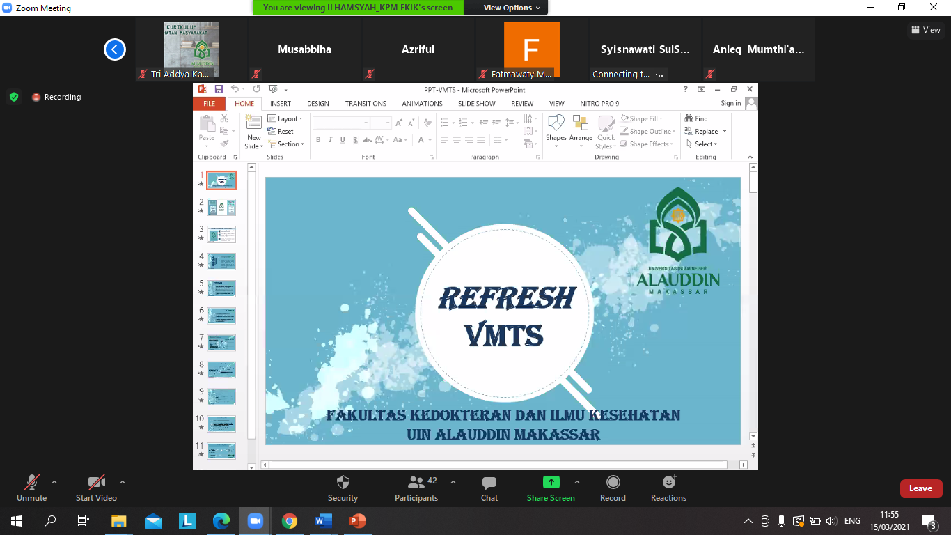 Kegiatan Refresh Visi, Misi, Tujuan dan Sasaran (VMTS) yang dilaksanakan pada tanggal 15 Maret 2021 merupakan salah satu kegiatan dari serangkaian program kerja komite penjaminan mutu (KPM) FKIK UIN Aladuddin Makassar. Refresh VMTS ini bertujuan untuk menyebarluaskan dan sekaligus mengetahui bagaimana pemahaman civitas FKIK UIN Alauddin Makassar tentang Visi, Misi, Tujuan dan Sasaran. Kegiatan ini dibuka Oleh Dekan FKIK UIN Alauddin Makassar Dr. dr. Syatirah, Sp. A., M.Kes dan di hadiri oleh para wakil dekan, pimpinan dan staf akademik, para ketua prodi, dosen, laboran dan mahasiswa FKIK UIN Alauddin Makassar. Refresh VMTS sebagai salah satu bentuk sosialisasi yang dapat merefresh kembali pemahaman civitas FKIK terhadap VMTS.